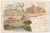 1899 (Vorläufer) Pardubice, Pardubitz; Radnice, Prumyslova skola, Partie od Chrudimky / town hall, school, riverside. Lit. F. Hoblík Art Nouveau, floral, litho (r)